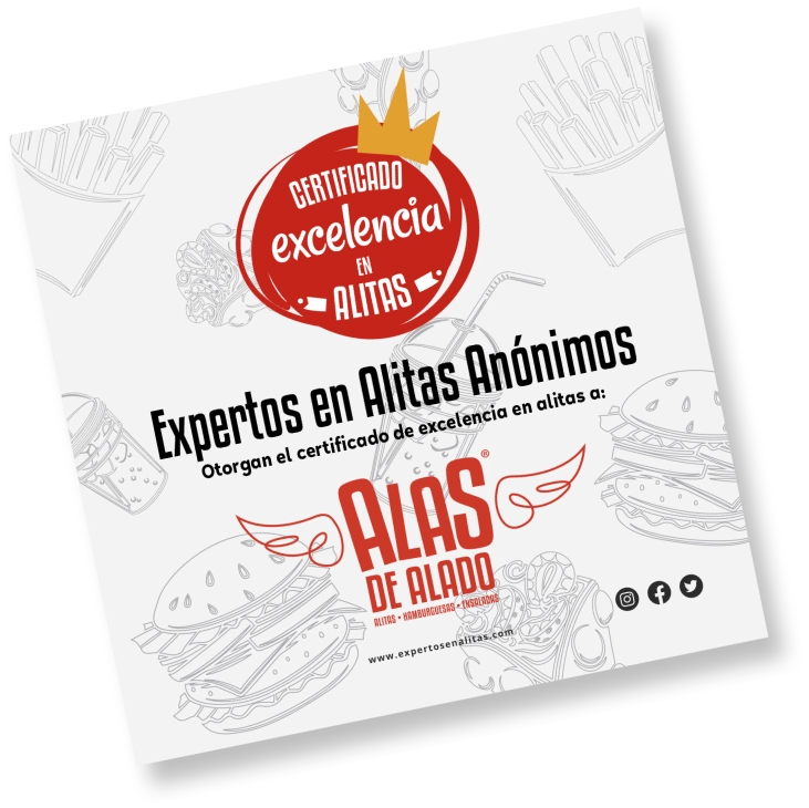 Los “EAA” (Expertos en Alitas Anónimos), personas que han recorrido TODO MORELOS en busca de las mejores alitas, han otorgado a Alas de Alado el "Certificado de Excelencia en Alitas"